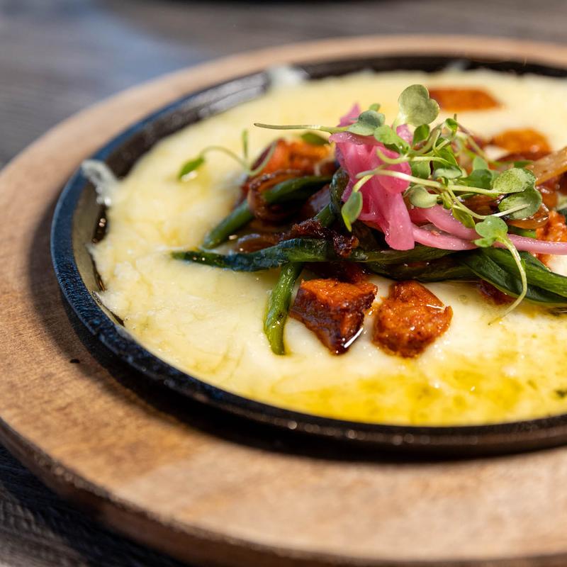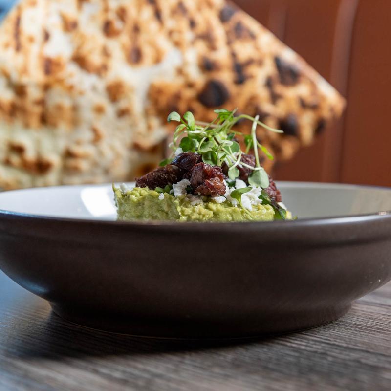 Made to order with roasted anaheim pepper, pomegranate, onion and cilantro. Garnished with queso fresco and served with a charred flour tortilla | Add Ribeye Chicharron