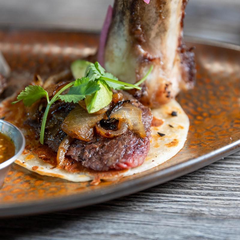 Made to order with chicharron ribeye, roasted Anaheim pepper, pomegranate, onion, and cilantro. Garnished with queso fresco and chef's Jamaica sauce, served with a choice of charred flour tortilla or corn tortilla