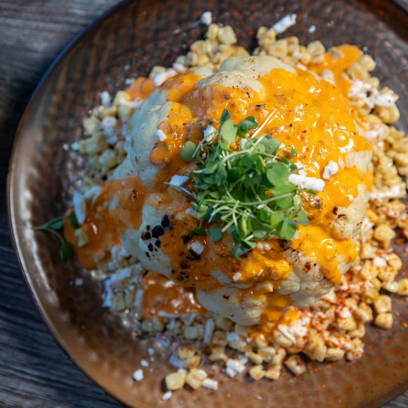 Three-egg omelet filled with sautéed zucchini, caramelized onions, fresh spinach, and mushrooms, served over a silky sweet corn and guajilo Chile cream and cambray potatoes