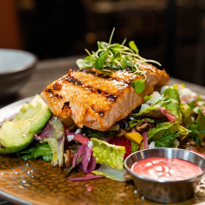 Mixed greens, mango, raspberries, cucumber, avocado, walnuts and goat cheese. Tossed in a raspberry vinaigrette