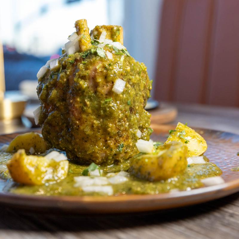 Kurobata braised pork shank and potatoes topped with onion and cilantro. Served with rice and beans & homemade tortillas. Choice of sauce: Chile verde or Mole artesanal